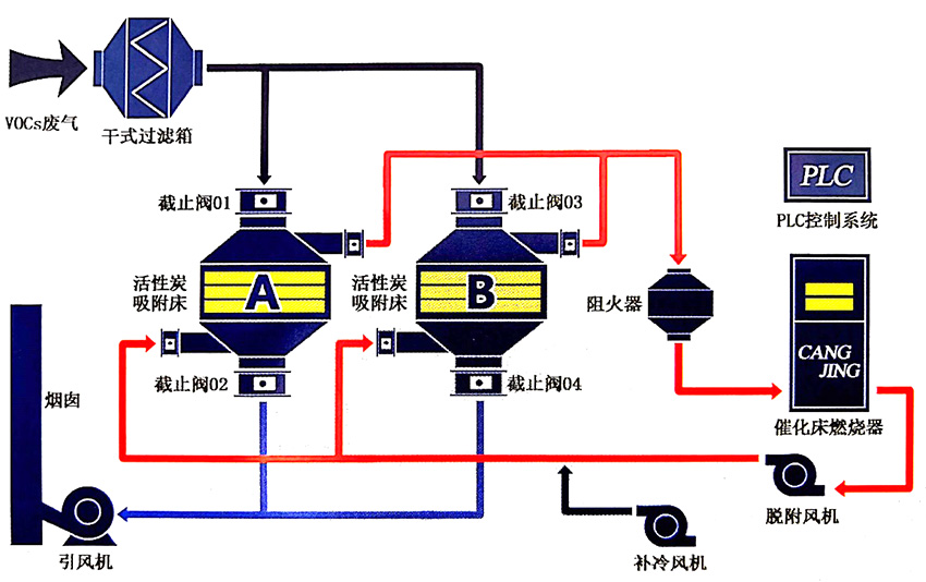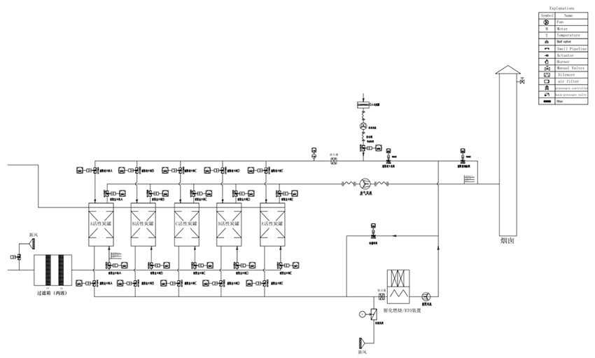 本凈化裝置采用雙氣路連續(xù)工作,設(shè)兩個或多個吸附床可交替使用,先將有機廢氣用活性炭吸附,當快達到飽和時停止吸附操作,然后用熱氣流將有機物從活性炭上脫附下來使活性炭再生;脫附下來的有機物已被濃縮并送入催化燃燒室轉(zhuǎn)化成CO2和H2O排出,當有機廢氣濃度合適的情況下,有機廢氣可維持自燃,不用外加熱,燃燒后的尾氣一部分排入大氣,大部分送往吸附床,用于活性炭的脫附再生。這樣能滿足燃燒和脫附所需的熱能,達到節(jié)能的目的,再生后的活性炭也可用于下次吸附。裝置既適合于連續(xù)操作,也適合于間斷操作。